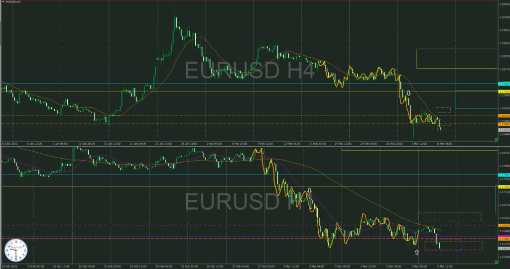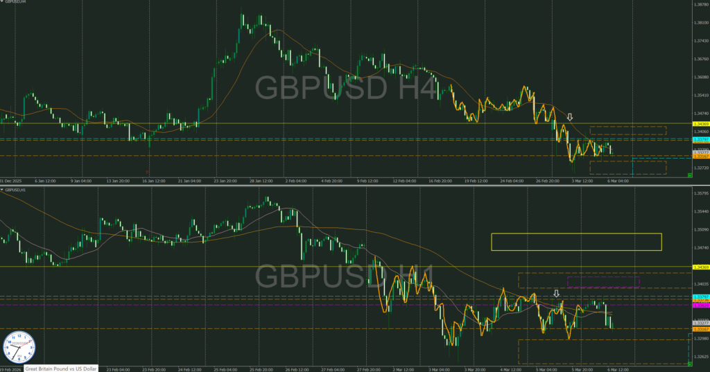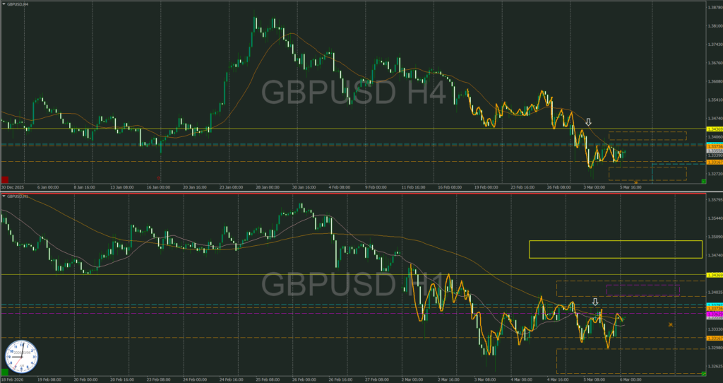 オレンジ破線4時間上下ラインに売り抑え、買い支え勢力