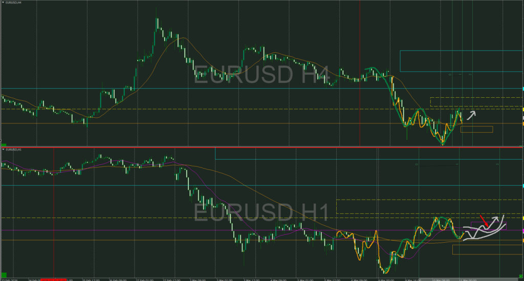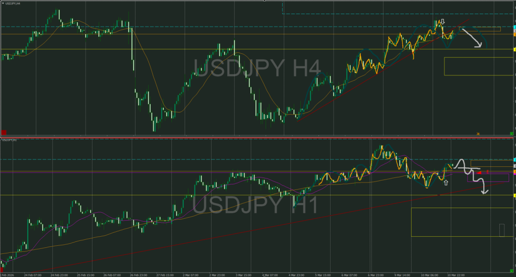 日足サポート戻りすぎの中まだ押しを付けている状態で1時間は転換シグナルが出ていない、4時間MAでサポートされている