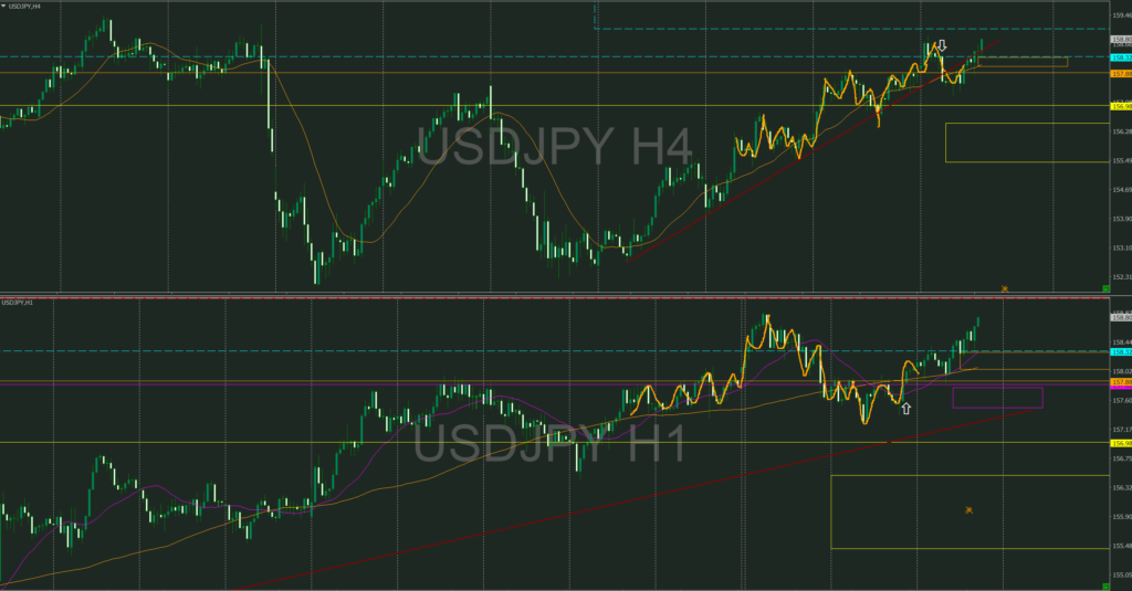 シナリオも想定通り押しをつけて4時間トレンドに乗って動いており週足のレジラインを超え伸びている