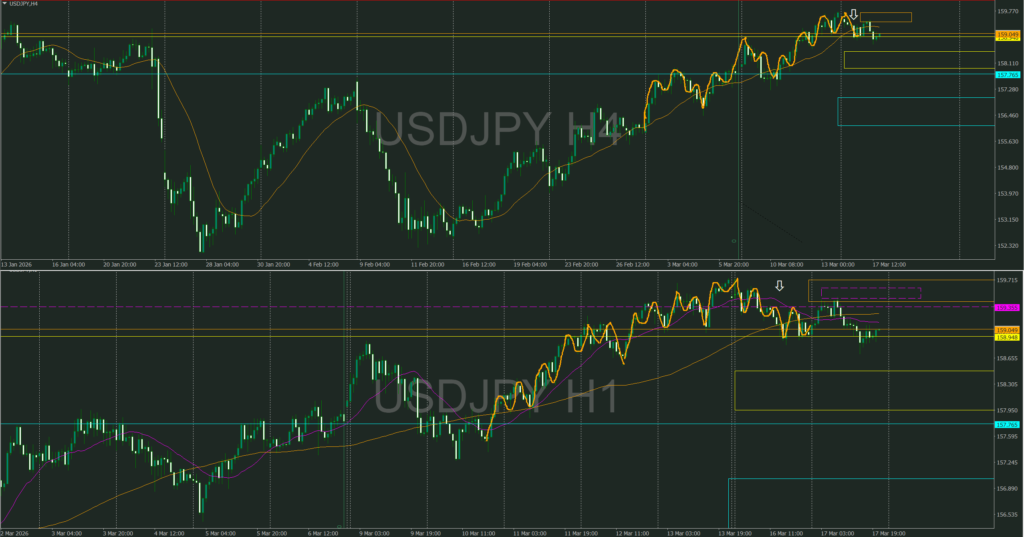 日足のレジラインに到達している為、ここから存在が確認できたら1時間転換シグナルを待って売っていきたい