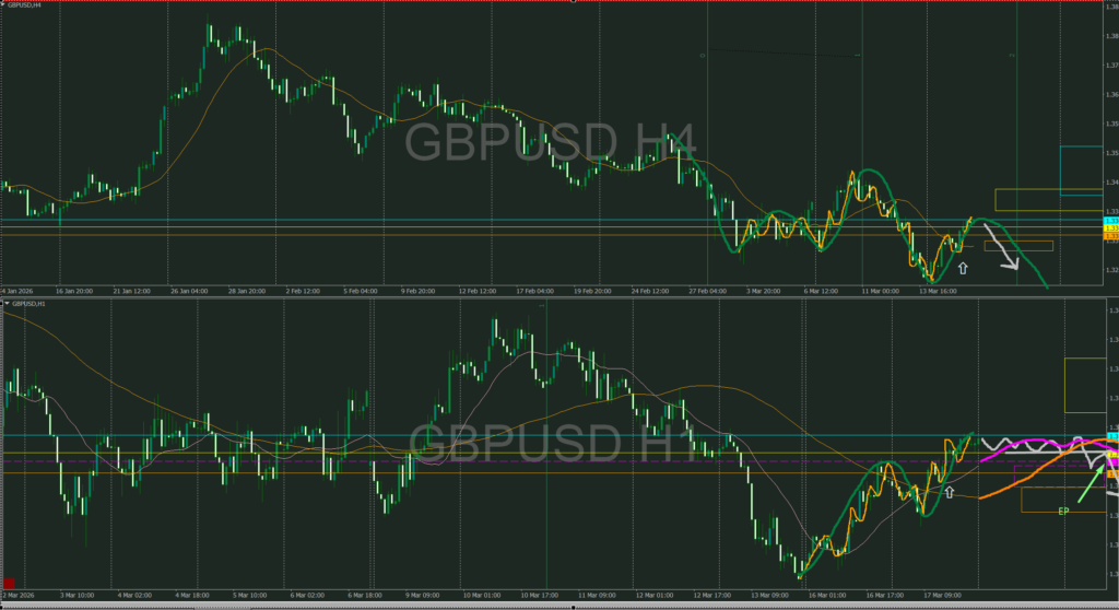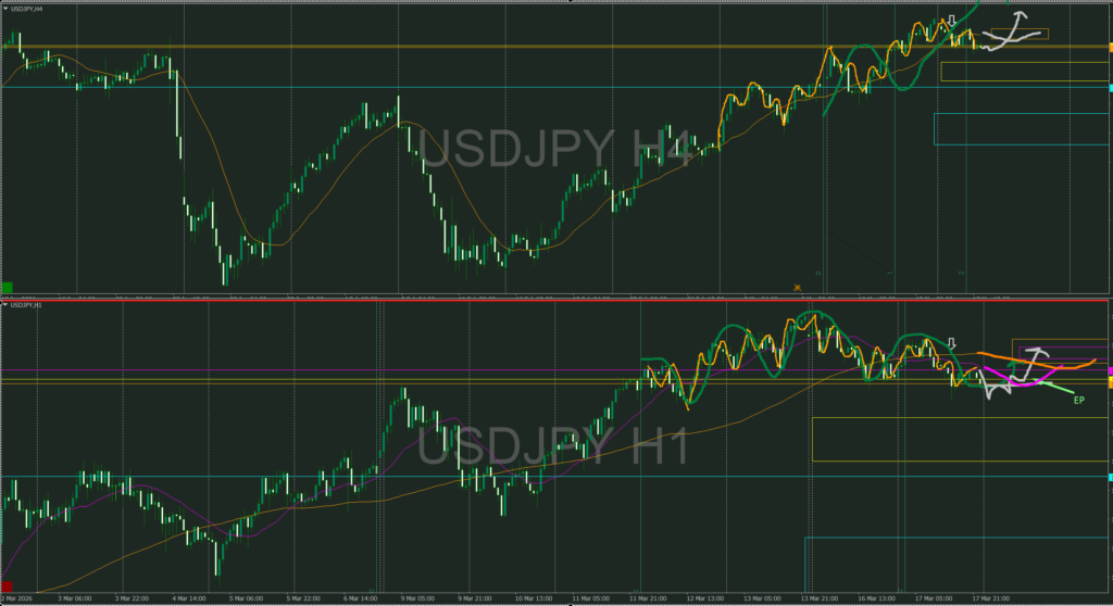 もし、今日あっさりと上へ転換したら1時間MAは下からサポートする形でエントリーできるとしても4時間MAはまだ上でリスクが大きくなるからそれを踏まえてポジション減らすか、4時間も抜けて入るか検討する