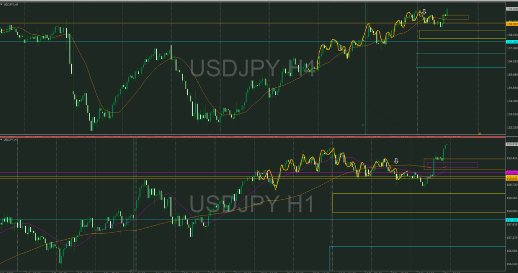 1時間のレジラインで下へ波出てるし4時間と日足で喧嘩した後4時間レジラインから下に波が出て日足が買って一気に上がった