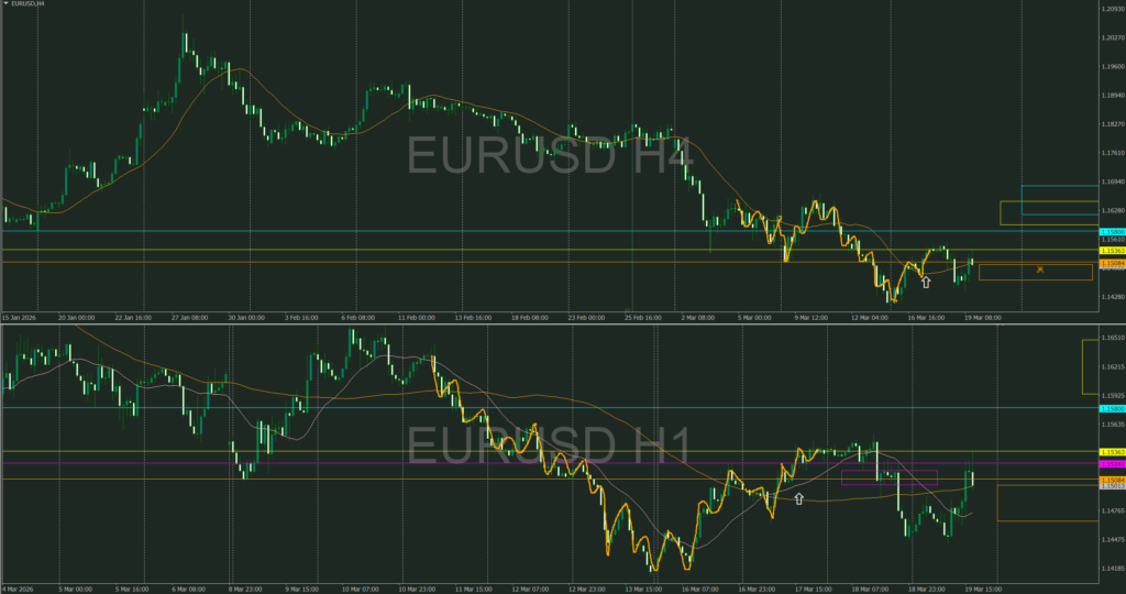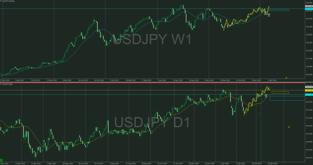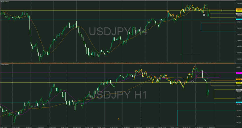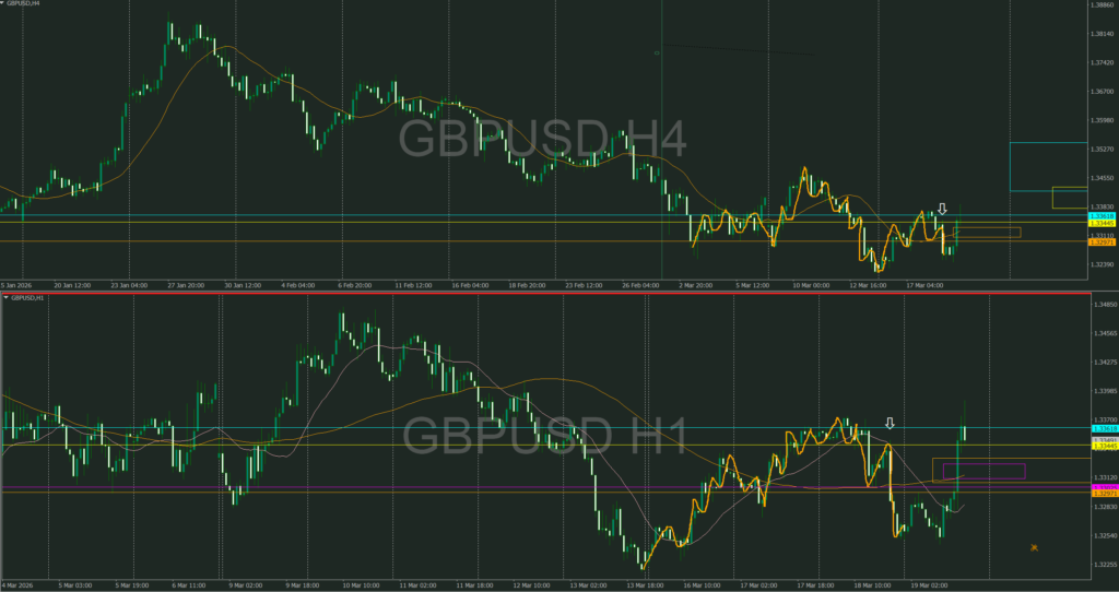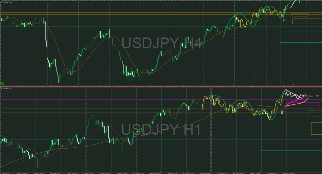 4時間が強く上昇し4時間・1時間の同時高値抜けによりここからは1時間の攻防ラインを待つ