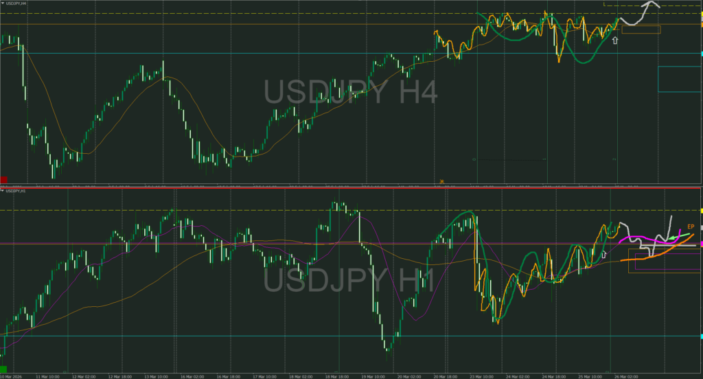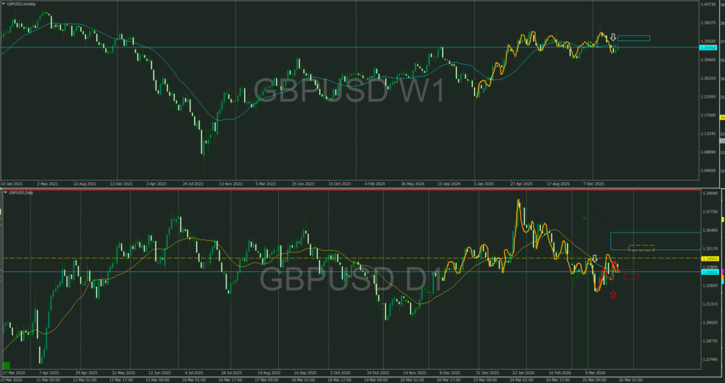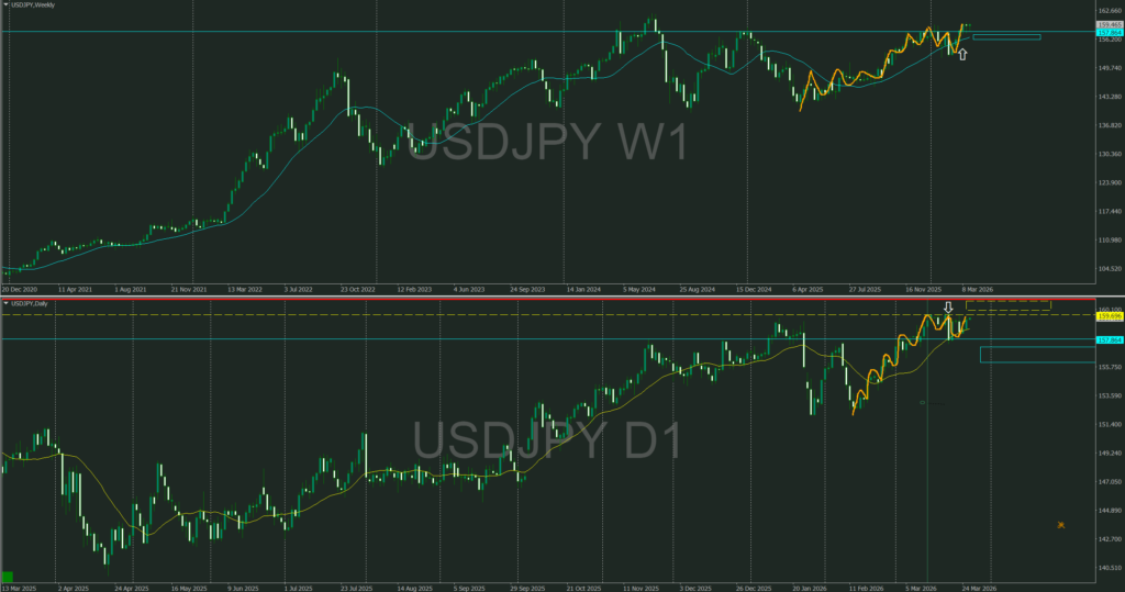 週足押し目買いが下支えする中、日足はレジラインを上抜ければトレード転換シグナルが出て目線が上になる辺りにいる