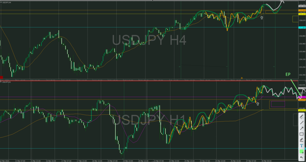 このまま上に伸びていくかもしれないが、日足の上昇の波に乗って4時間トレンドを追いかけていくが、波の幅的には一旦4時間サポートまでの押し目を待って存在確認した後の1時間反転を狙いたい