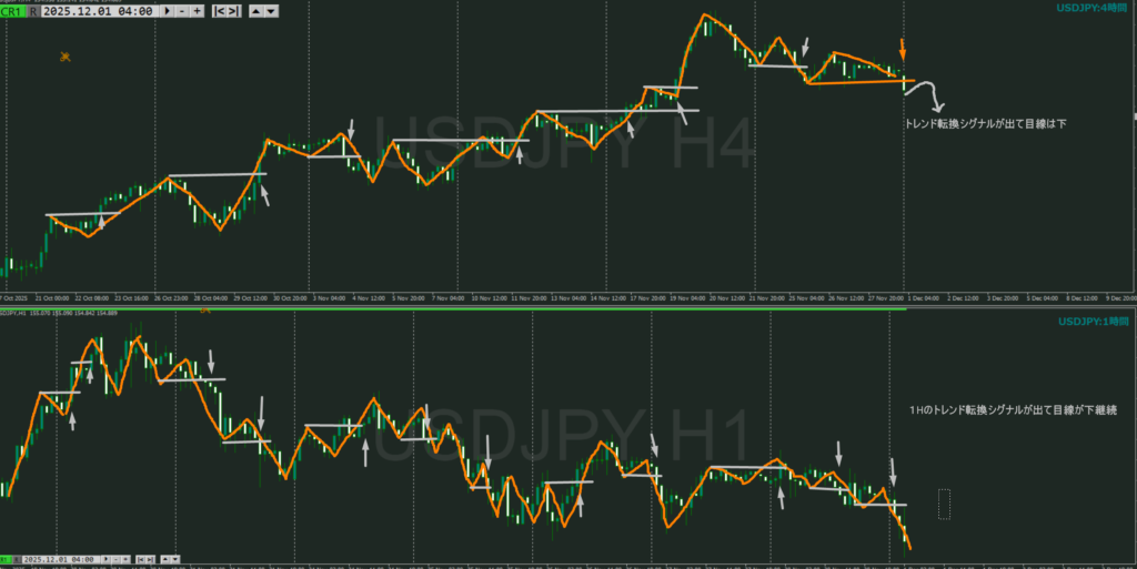 ここで確定されればこのろうそく足がトレンド転換シグナルとなり目線が上になる