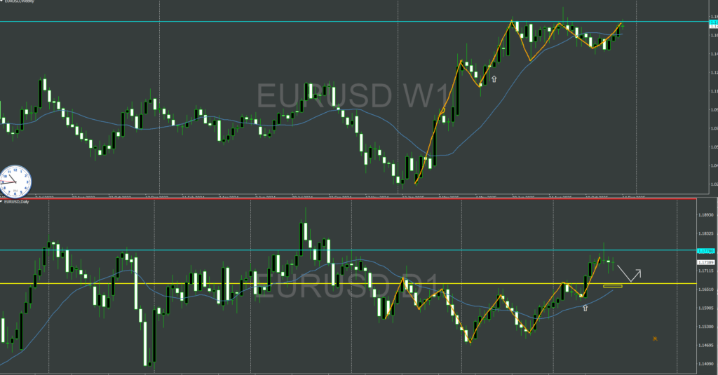 ダウカウントの見方を変え波を少し細かく見ると今日の陽線でこのまま今週陽線で終わると週足のトレンド転換シグナル確定となり目線が上へ変わる