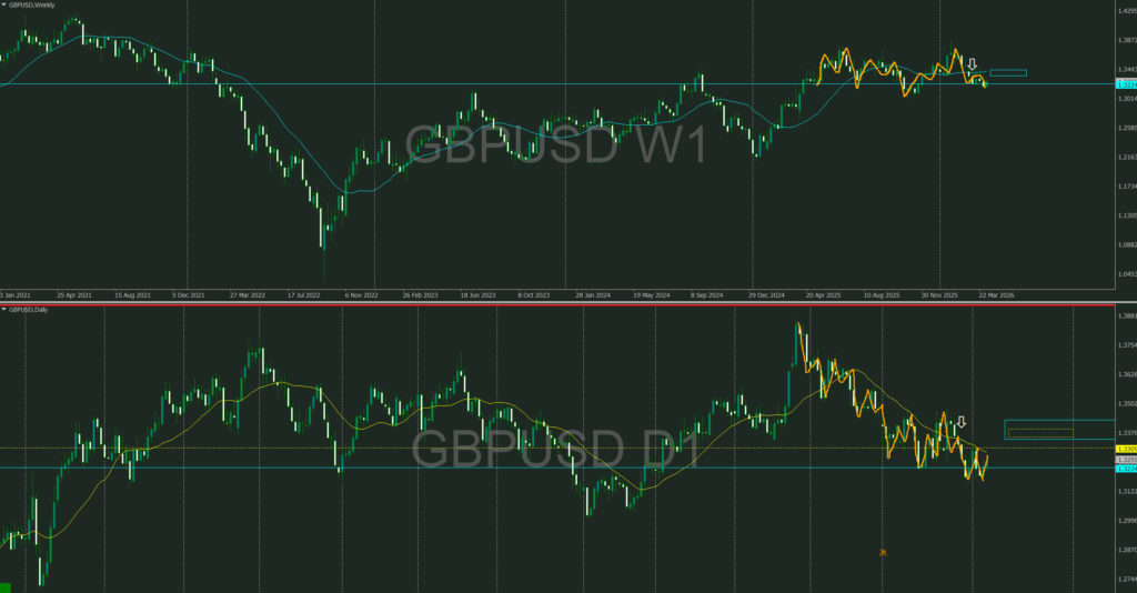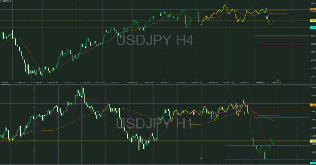 週足が日足戻り売り勢力いる中、4時間押し目買い付近で日足のレジラインまで60Pipsあるが、日足MAがま上に存在しリスクが大きい為狙わない