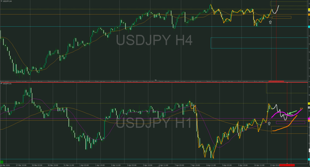 4時間では波が出た後なのでここから押しを付けて4時間サポートでの存在確認後、1時間の転換を待ちたい、大体今夜欧州からニューヨーク始め位の時間を想定する