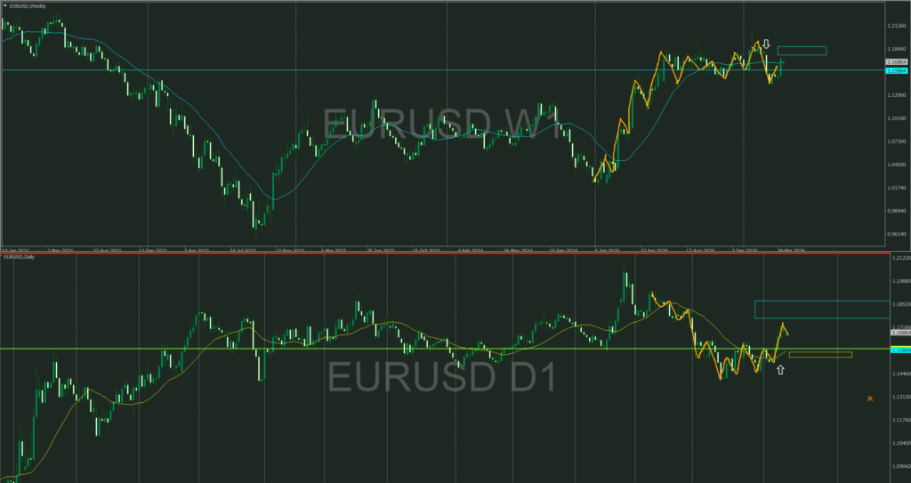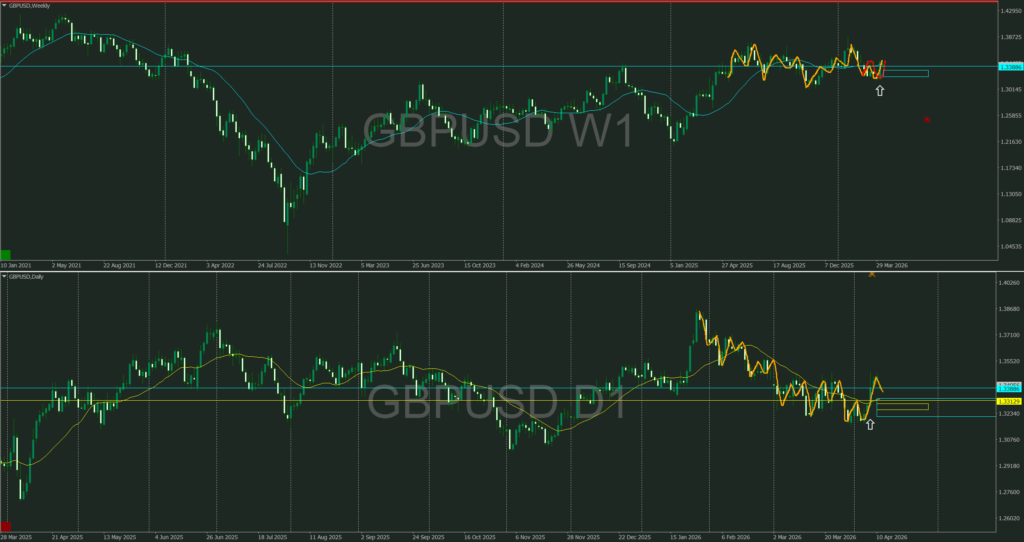 週足がダウカウント2つで大きな流れが分かりずらく日足は一気に上目線となり価格が上昇し押しを付けているが、まだ下げ止まりは見せていない為押し目形成中