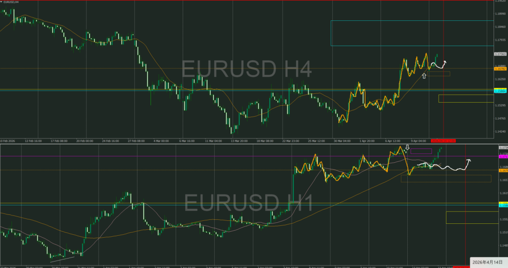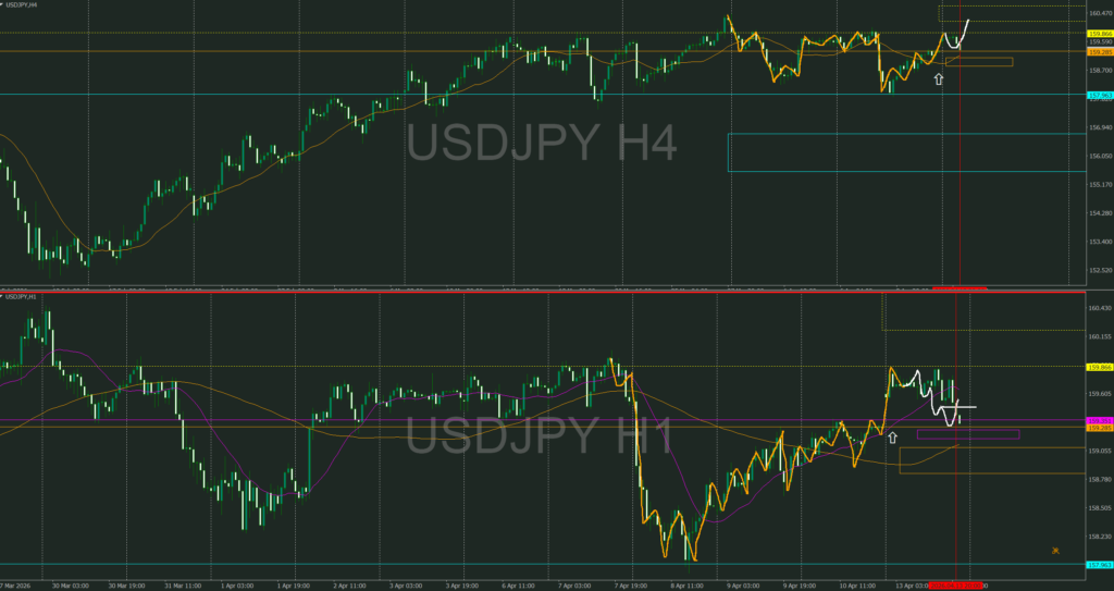 4時間の戻り売りを消化した後の1時間高値超えTTSがでたら買いを検討するが、間延びした波が想定され時間経過が明日12時以降もっと要することもあり得る
