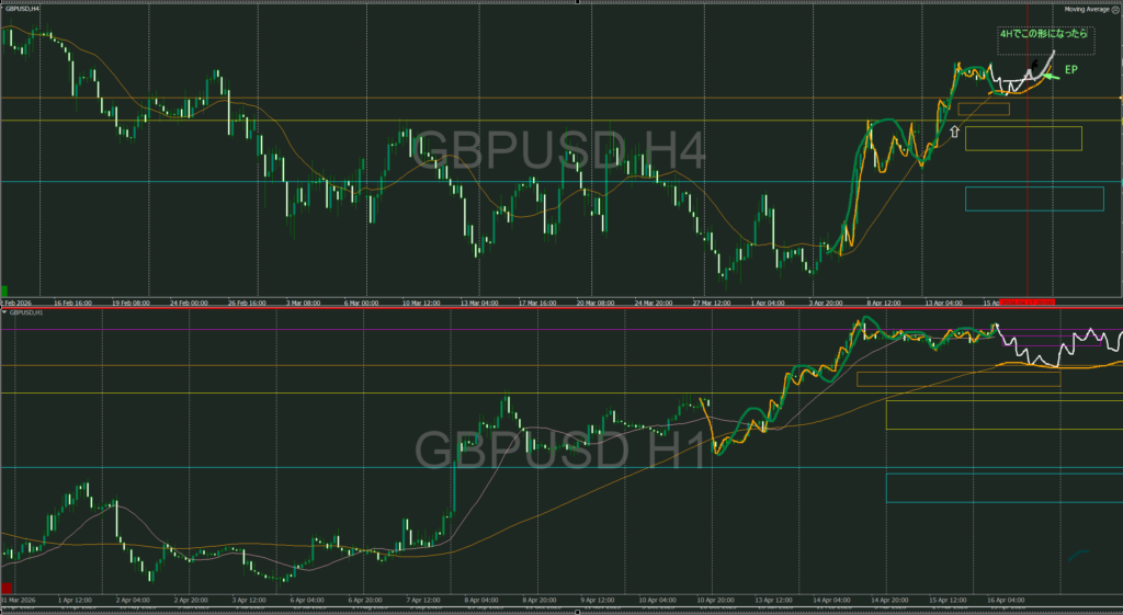 4時間の攻防ライン抜け待ちで今4時間TTSが出たのでここから戻しを付けたあとの1時間転換待ち、