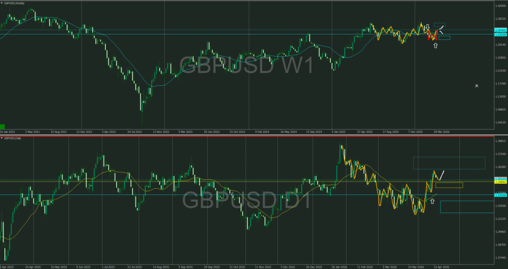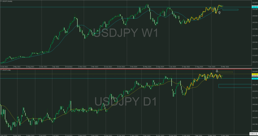 週足押し目買いが居る中で、日足のレジラインは遠くに存在、日足を調整としたならばここから上へ向かう可能性もあるが不確実性には掛けられない