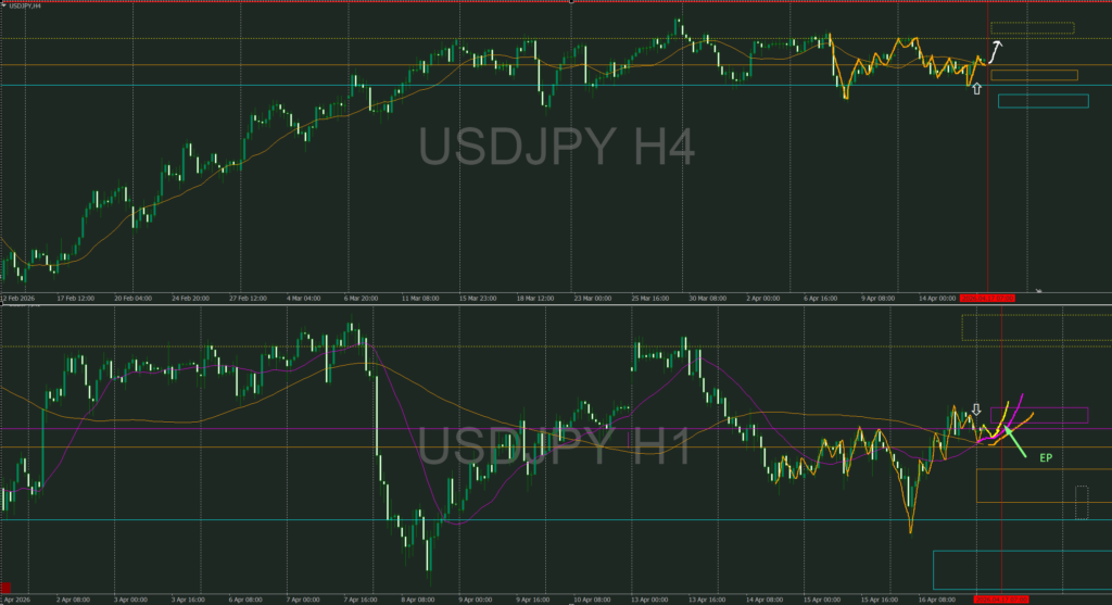 日足は上目線だが大きく上昇後停滞中、4時間と1時間のもみ合いが続いており多少上や下に抜けても戻される可能性あり