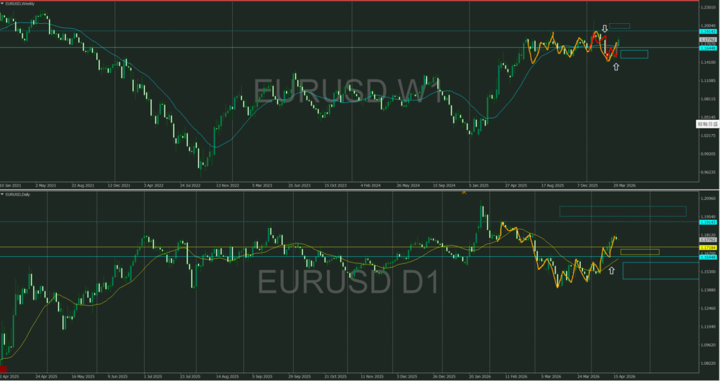 青のサポート下には週の押し目買い勢力、オレンジなら戻りすぎで破線レジライン上には売り抑え勢力