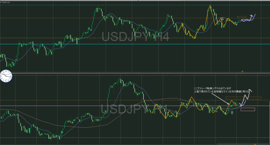 オレンジ破線が4時間レジスタンスラインで上には売り抑え勢力がいる