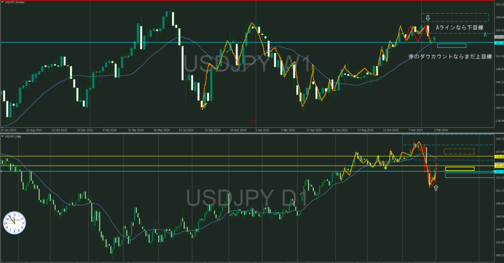 上への波が出るかは分からない状況だったが自分の引いた週足の破線で止められている