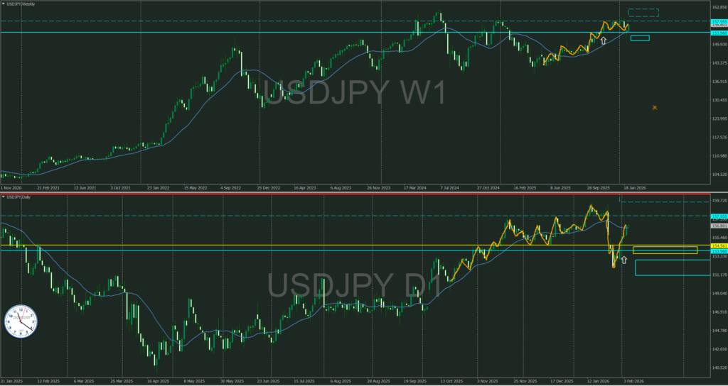 今週まだ未確定だが今のところ青の週足サポートとMAの買い支え勢力に支えられて上昇中