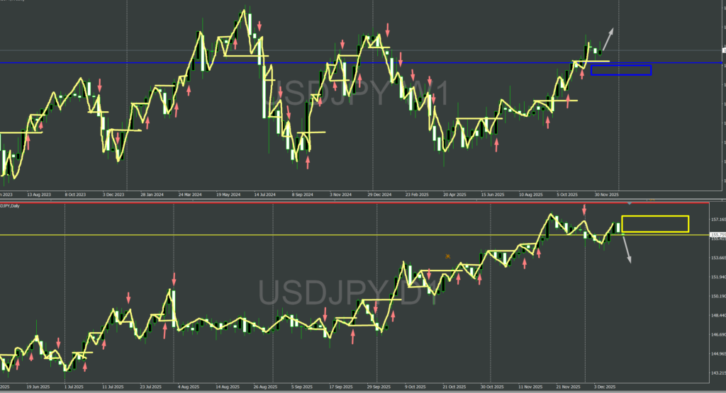 黄色のサポートラインの下に日足の押し目買い勢力、その下には週足の押し目買い勢力も居る為かなり強いサポートとなっている