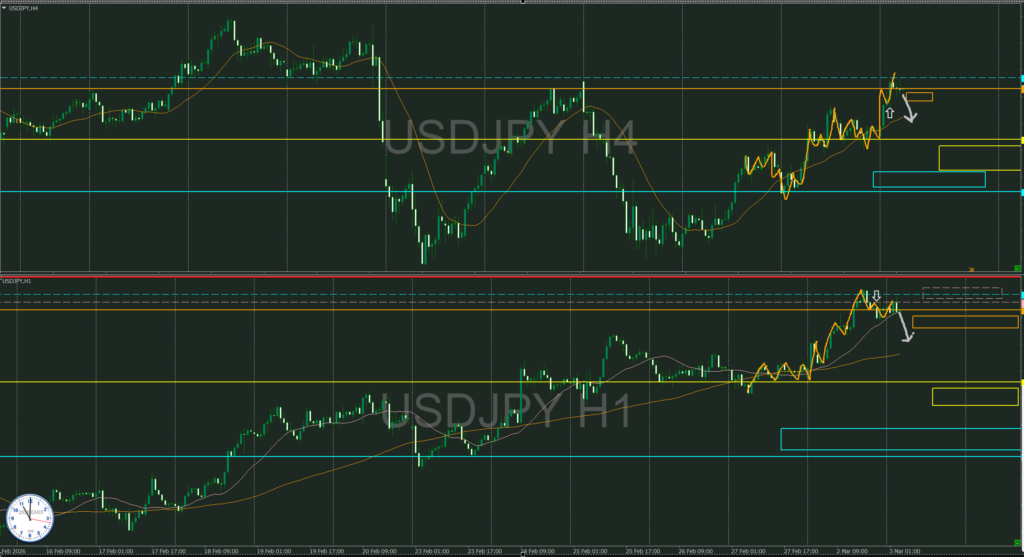 日足・週足がラインの際にいて目線が一致せずなので日足のローソク足がどっちにも伸びない状態の中でのトレードはリスク大なので4時間では戻り売り検討としたが、目線が方向決まるまでは静観する